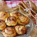 - Teig der Länge nach aufrollen, 12 gleichgroße Schnecken aus der Rolle schneiden